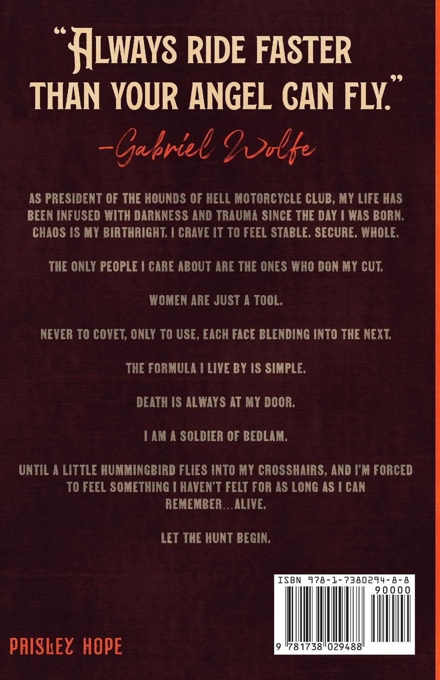 Always ride faster than your angel can fly... Gabriel Wolfe, the fallen dark angel and club president of the Hounds of Hell MC. His life has been infused with darkness and trauma since the day he was born, forcing more than just desensitization to violence and chaos. Forcing him to crave it to feel stable. Secure. Whole. With only a handful of people he cares about, his family, the ones that don his cut, women are just a tool, a means to an end. Never to covet, only to use. Each one blending into the next. The formula he lives by is simple. Death is at your door. You are a soldier of bedlam. Nothing more, nothing less… Until the moment a little hummingbird flies into his crosshairs, forcing him to feel something he hasn’t felt for as long as he can remember…alive. Let the hunt begin.