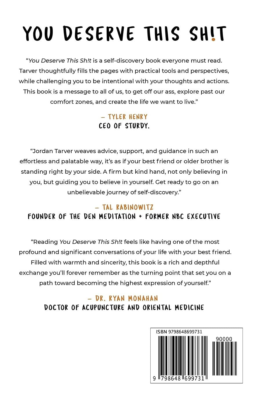 Are you feeling lost, stuck, or confused? You may need a roadmap for the journey from where you are now to becoming the best version of yourself. In this authentic self-help book, Jordan Tarver, introspective author and world traveler, guides you on a journey of self-discovery. A close call with death at the age of 19 and a soul-searching solo backpacking trip at 21 taught Jordan how to live. Since then, he's dedicated himself to living a life infused with meaning and empowering others to do the same. He uses inspiring stories, workable tactics, understandable action steps, and simple language that help you: ① Get unstuck ② Find your path ③ Become the best version of yourself As you progress through its pages, you’ll learn how to create positive change in your life NOW to live the life of your dreams FOREVER. By the end of You Deserve This Sh!t, you’ll have a newfound awareness of yourself and the world around you, the courage to always go outside your comfort zone, and the passion for living an intentional life. You will feel empowered to make choices that align with your goals and feel deserving of the exact life you want to live. Let your journey begin. This book is your nudge. ◆◆◆ BONUS: Enjoy free content at the end of the book to continue your journey of becoming the best version of yourself.