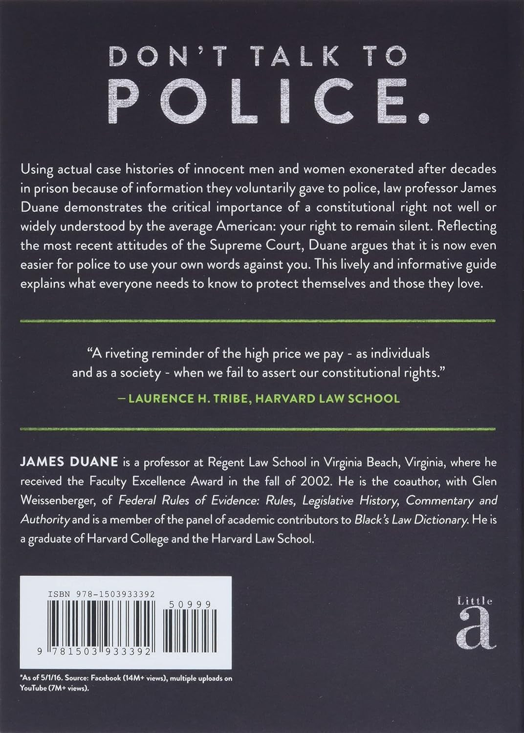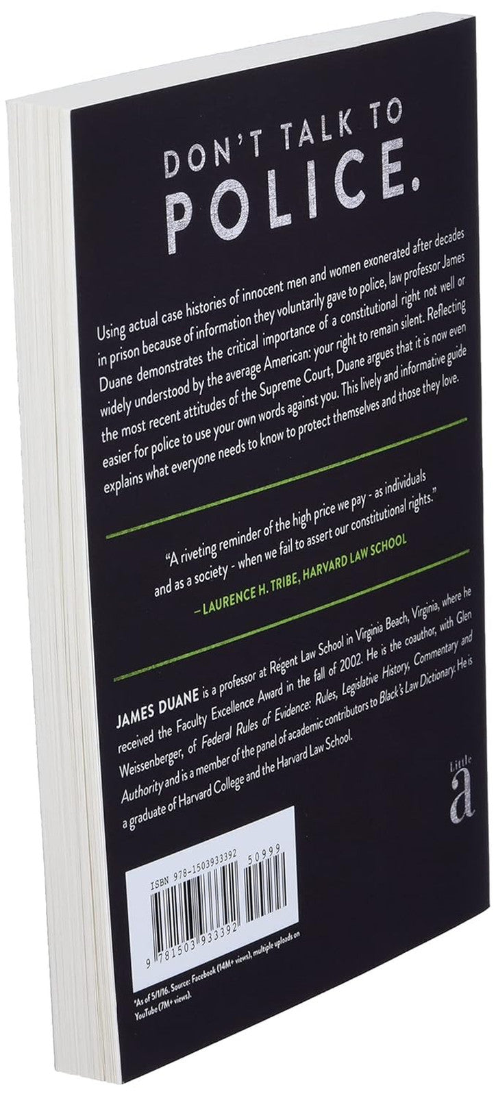 An urgent, compact manifesto that will teach you how to protect your rights, your freedom, and your future when talking to police. Law professor James J. Duane became a viral sensation thanks to a 2008 lecture outlining the reasons why you should never agree to answer questions from the police―especially if you are innocent and wish to stay out of trouble with the law. In this timely, relevant, and pragmatic new book, he expands on that presentation, offering a vigorous defense of every citizen’s constitutionally protected right to avoid self-incrimination. Getting a lawyer is not only the best policy, Professor Duane argues, it’s also the advice law-enforcement professionals give their own kids. Using actual case histories of innocent men and women exonerated after decades in prison because of information they voluntarily gave to police, Professor Duane demonstrates the critical importance of a constitutional right not well or widely understood by the average American. Reflecting the most recent attitudes of the Supreme Court, Professor Duane argues that it is now even easier for police to use your own words against you. This lively and informative guide explains what everyone needs to know to protect themselves and those they love.