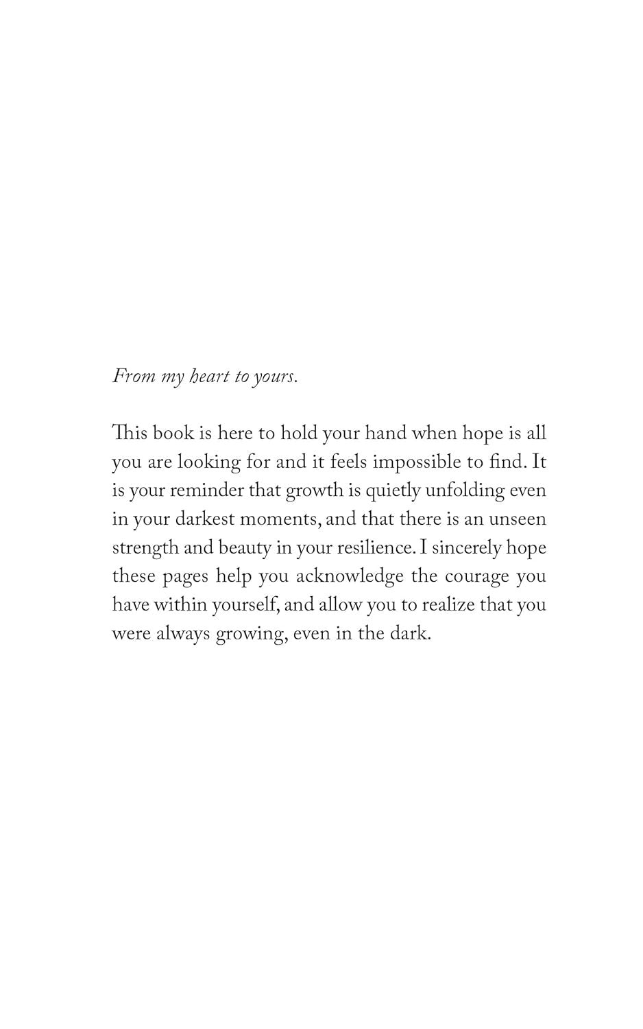 When hope feels impossible to find, let this book remind you of your strength, your courage, and the beauty in your resilience. Because you were always growing, even in the dark.