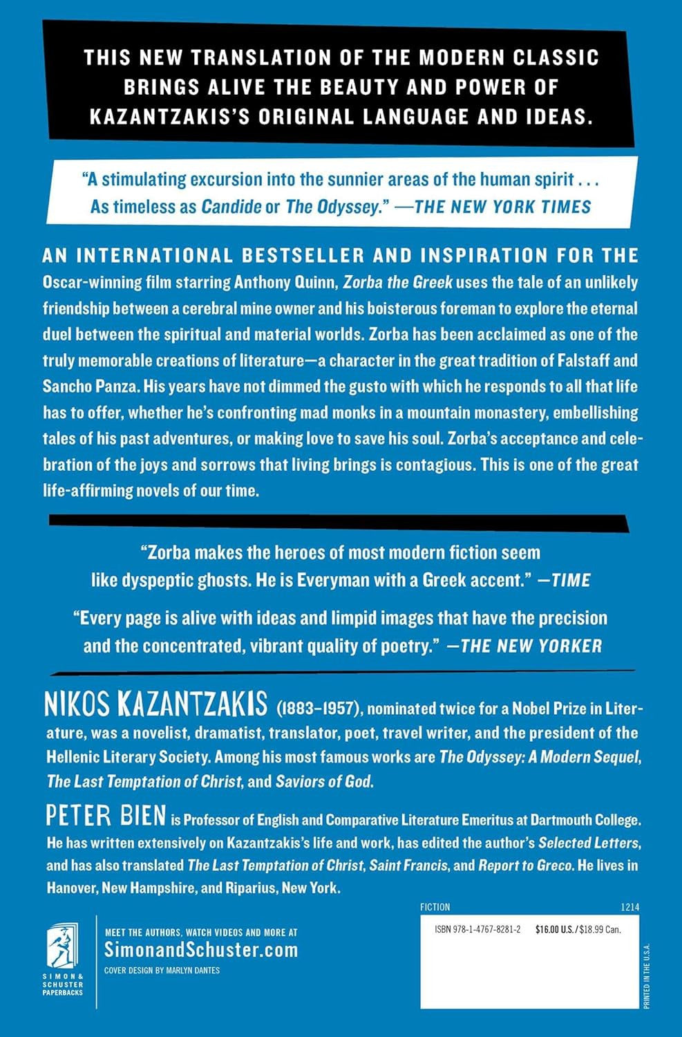 Zorba has been acclaimed as one of the truly memorable creations of literature—a character created on a huge scale in the tradition of Falstaff and Sancho Panza. His years have not dimmed the gusto and amazement with which he responds to all life offers him, whether he is working in the mine, confronting mad monks in a mountain monastery, embellishing the tales of his life or making love to avoid sin. Zorba’s life is rich with all the joys and sorrows that living brings and his example awakens in the narrator an understanding of the true meaning of humanity. This is one of the greatest life-affirming novels of our time.